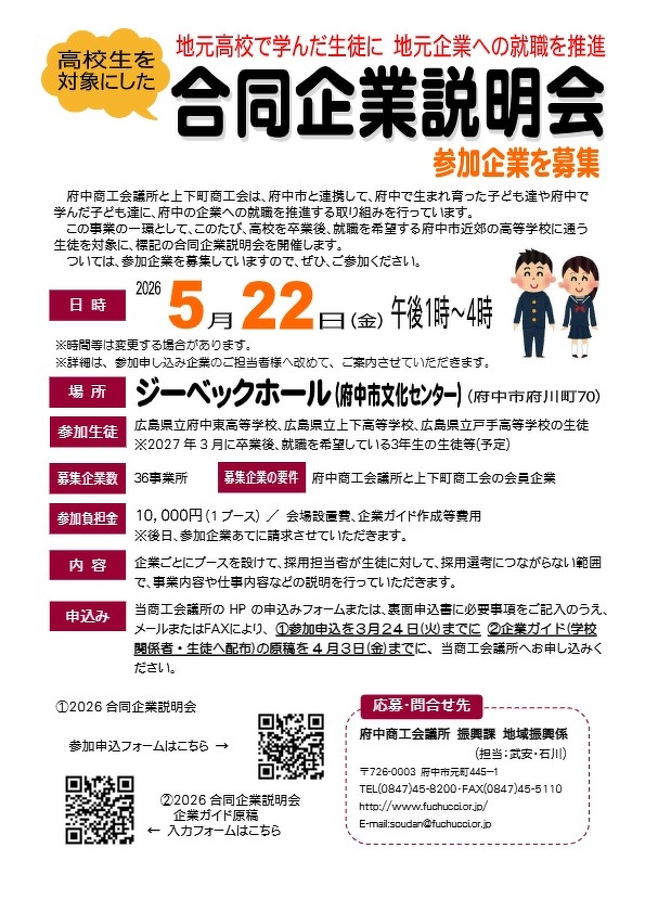府中U・Iターン推進会議(府中商工会議所、府中市ほか)は、高校を卒業後、就職を希望する府中市近郊の高等学校に通う生徒を対象に、次の通り、合同企業説明会を開催するにあたり、参加企業を募集しています。