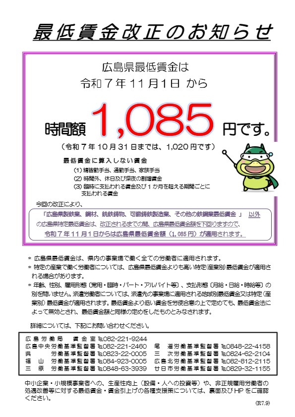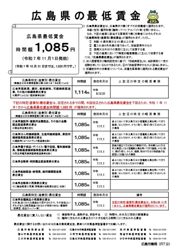 広島県最低賃金は11月1日から 時間額1,085円になります