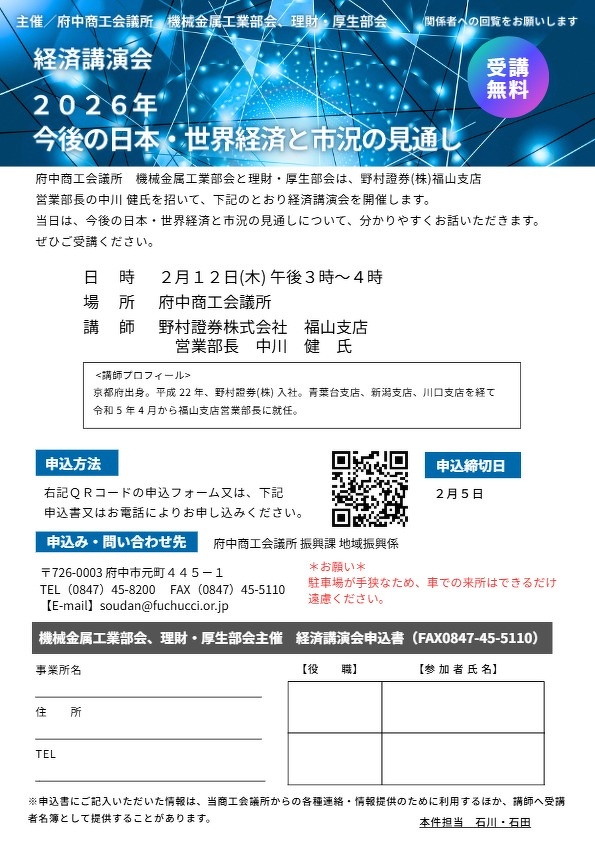 府中商工会議所 機械金属工業部会、理財・厚生部会 合同講演会「2026年今後の日本・世界経済と市況の見通し」*ご案内*