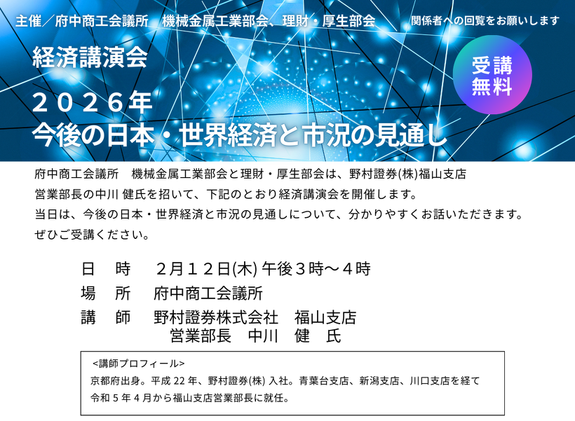 府中商工会議所 機械金属工業部会と理財・厚生部会は、野村證券(株)福山支店営業部長の中川 健氏を招いて、下記のとおり経済講演会を開催します。