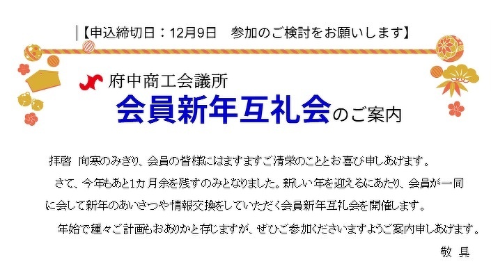 新しい年を迎えるにあたり、会員が一同に会して新年のあいさつや情報交換をしていただく会員新年互礼会を開催します。