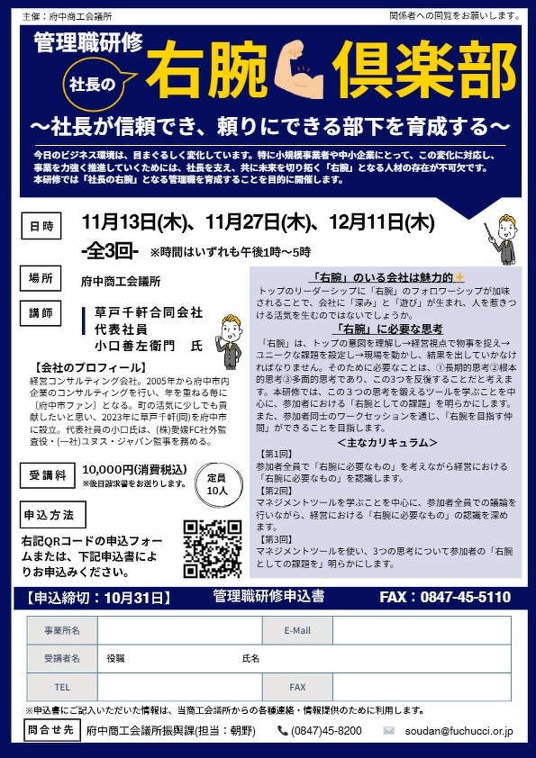 今日のビジネス環境は、目まぐるしく変化しています。特に小規模事業者や中小企業にとって、この変化に対応し、事業を力強く推進していくためには、社長を支え、共に未来を切り拓く「右腕」となる人材の存在が不可欠です。この研修は「社長の右腕」となる管理職を育成することを目的に開催します。